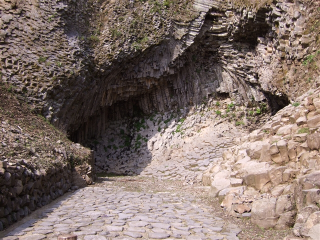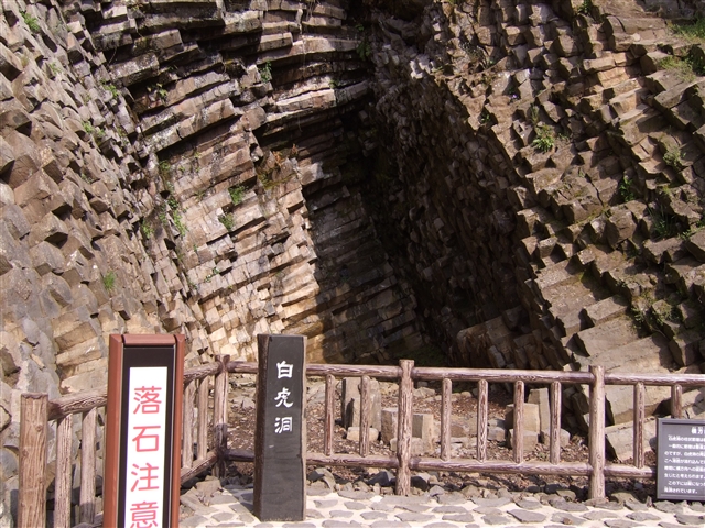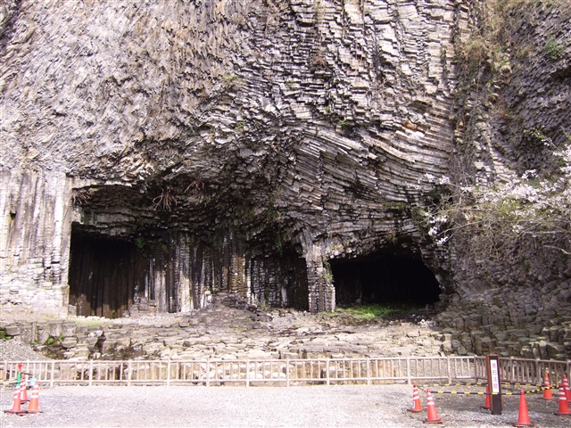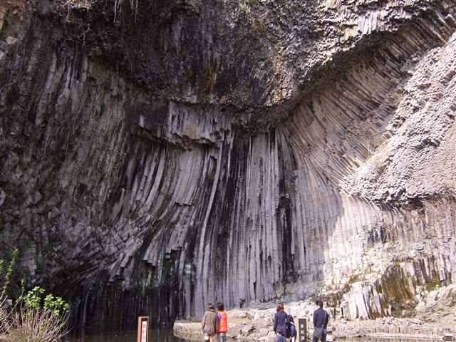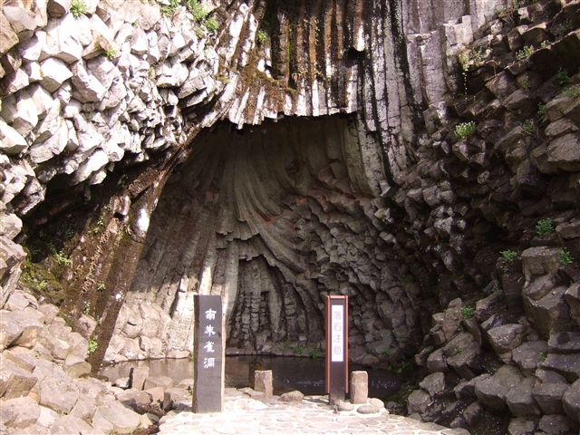 玄武洞は洞窟というよりも、マグマが固まる時に、規則正しいきれいな割れ目をつくりだしたもので、綺麗な円柱形の石がまるで人の手によって積み上げられたかのような模様を描き出した崖といった感じです。