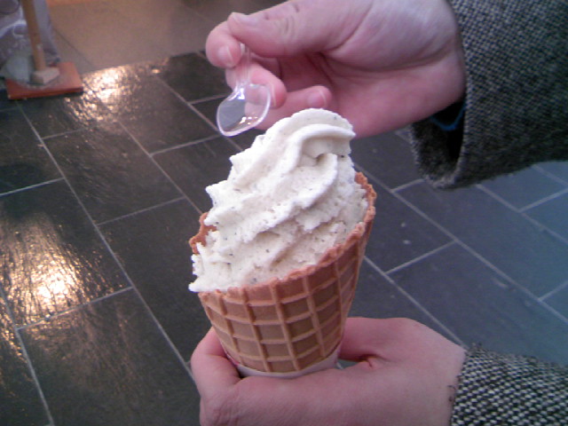 黒豆の味は良く分からなかったのですが^^;濃厚でとにかくおいしかったです。ワッフルコーンで300円でした。奥の方までしっかりとクリームが入っていました。