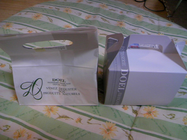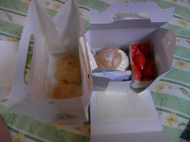ドエルといえば50円のシュークリーム。それを2つと、苺のケーキ(すいません名前を忘れました^^;。あとは生クリームの入ったシュークリームを1つ(126円)を購入しました。袋と箱に分けてもらいました^^