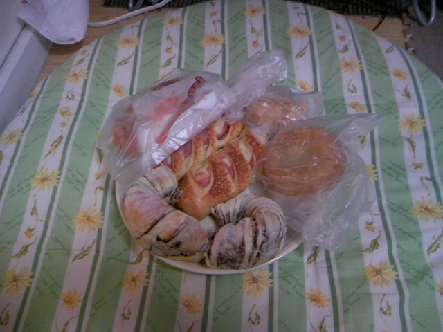 たくさん買ってしまいました(汗) ごちゃごちゃして見にくいですが、記憶の限りでは、「もちもちきなこ」「ふんわりシリーズ チョコ」「究極のクリームパン」「熟成カレーパン」「明太フランス」「ベーコンチーズ(?)とかそういう名前だったと思います」